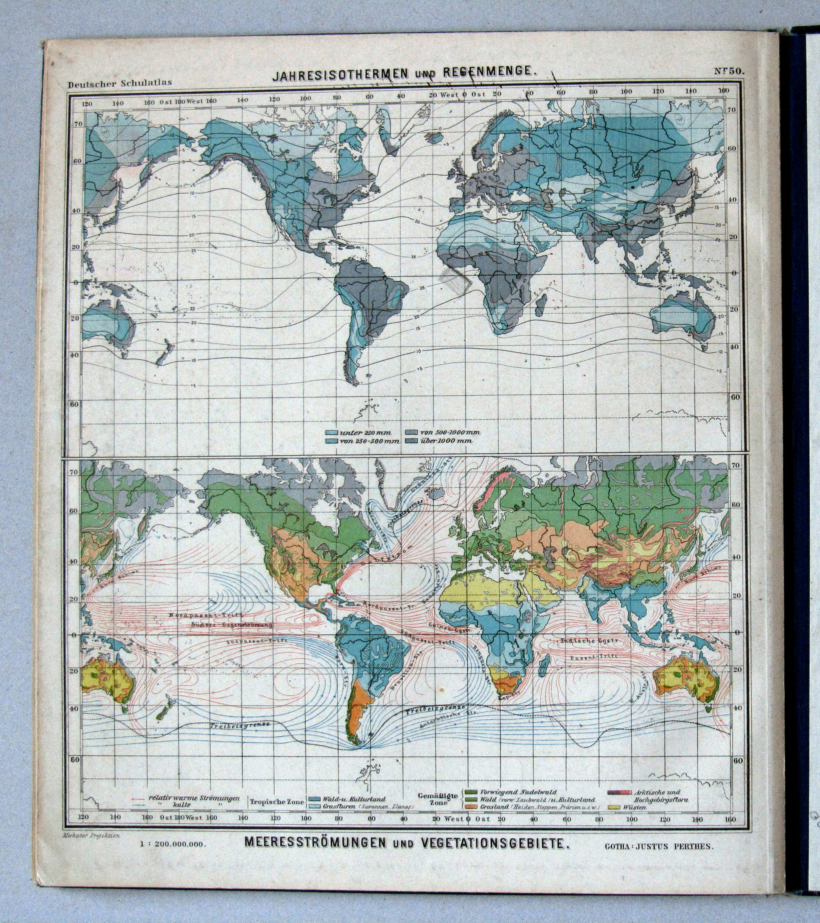 50. Jahres-Isothermen und Regenmenge. Meeresströmungen und Vegetationsgebiete