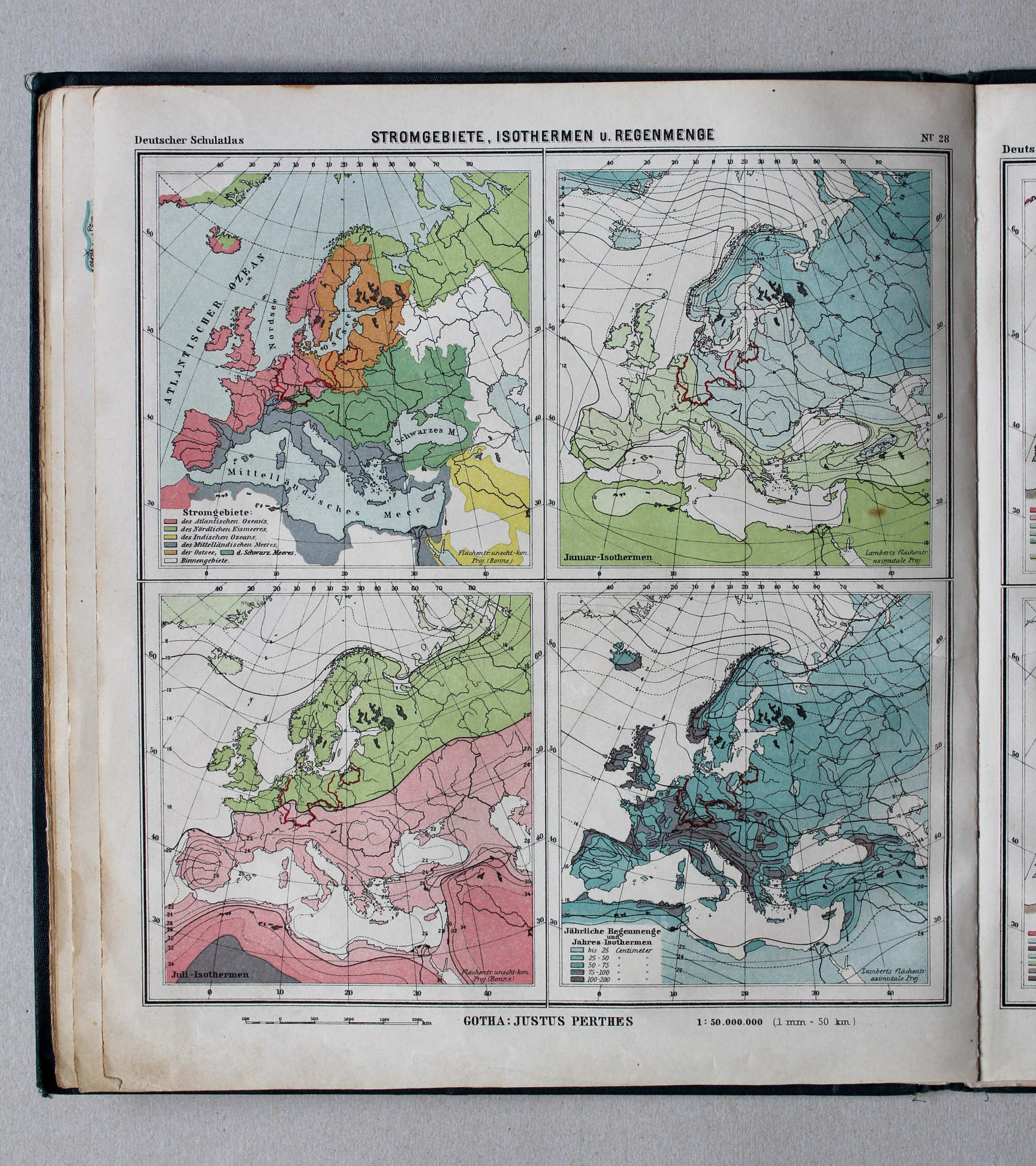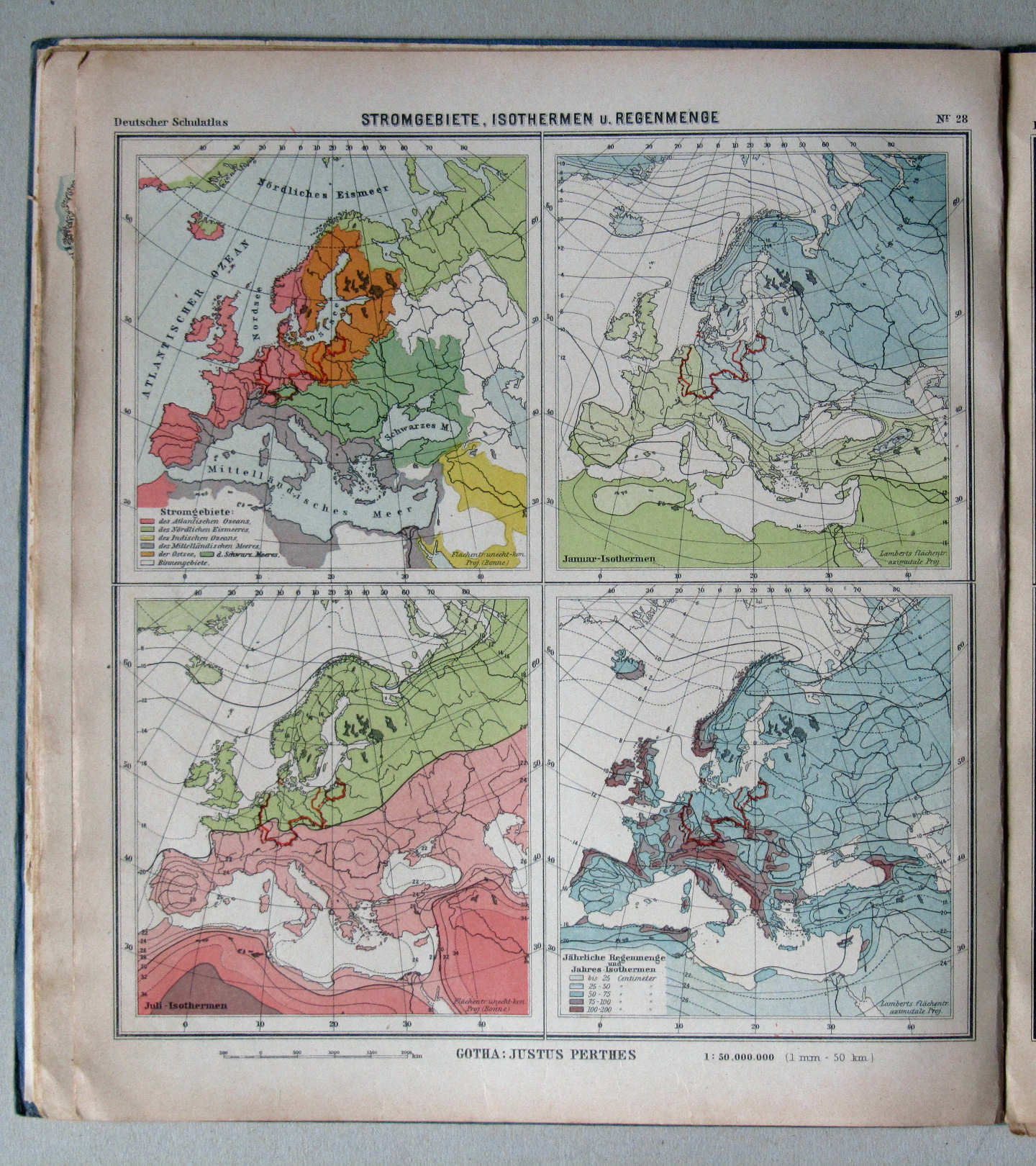 28. Europa: Stromgebiete, Isothermen u. Regenmenge