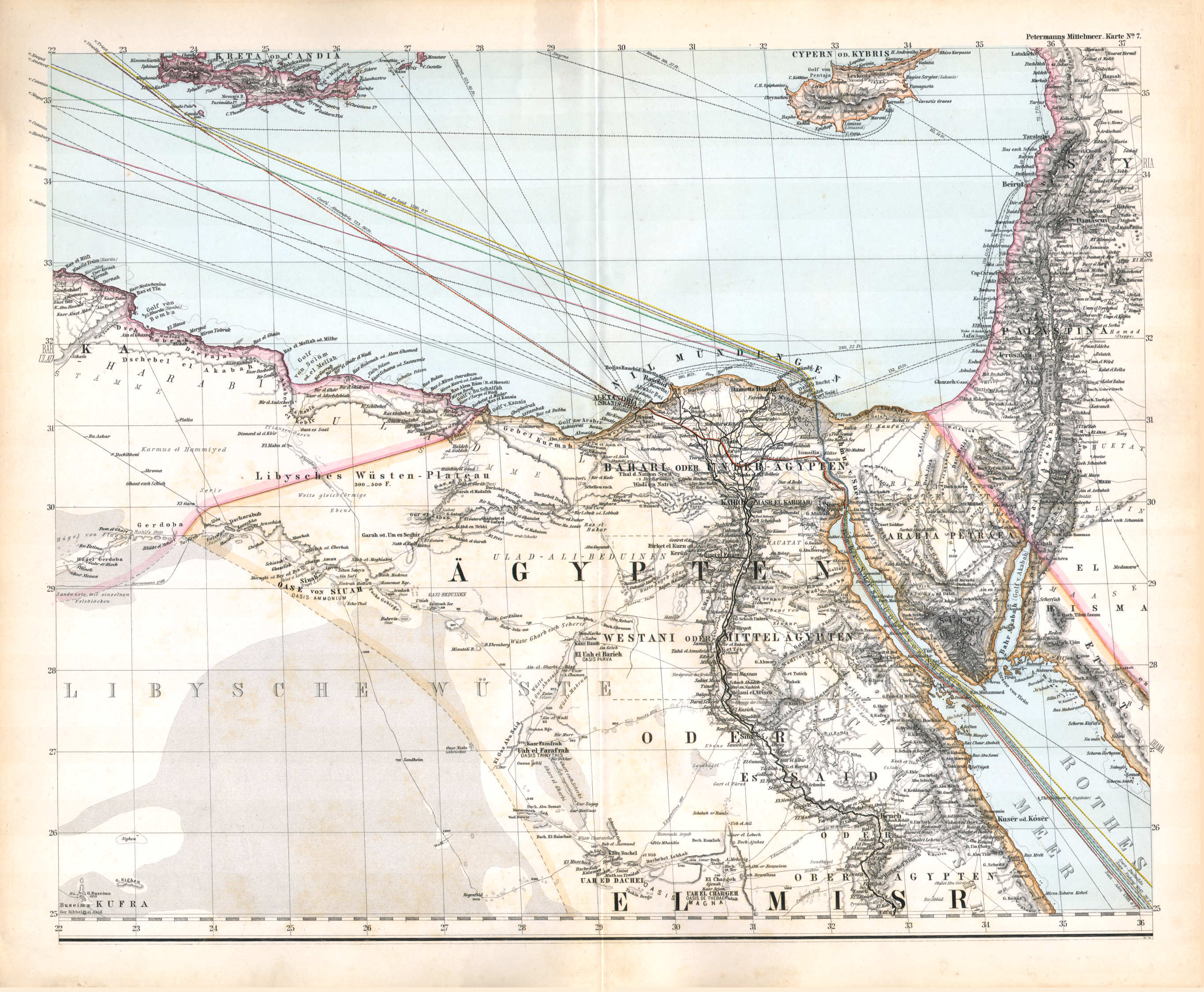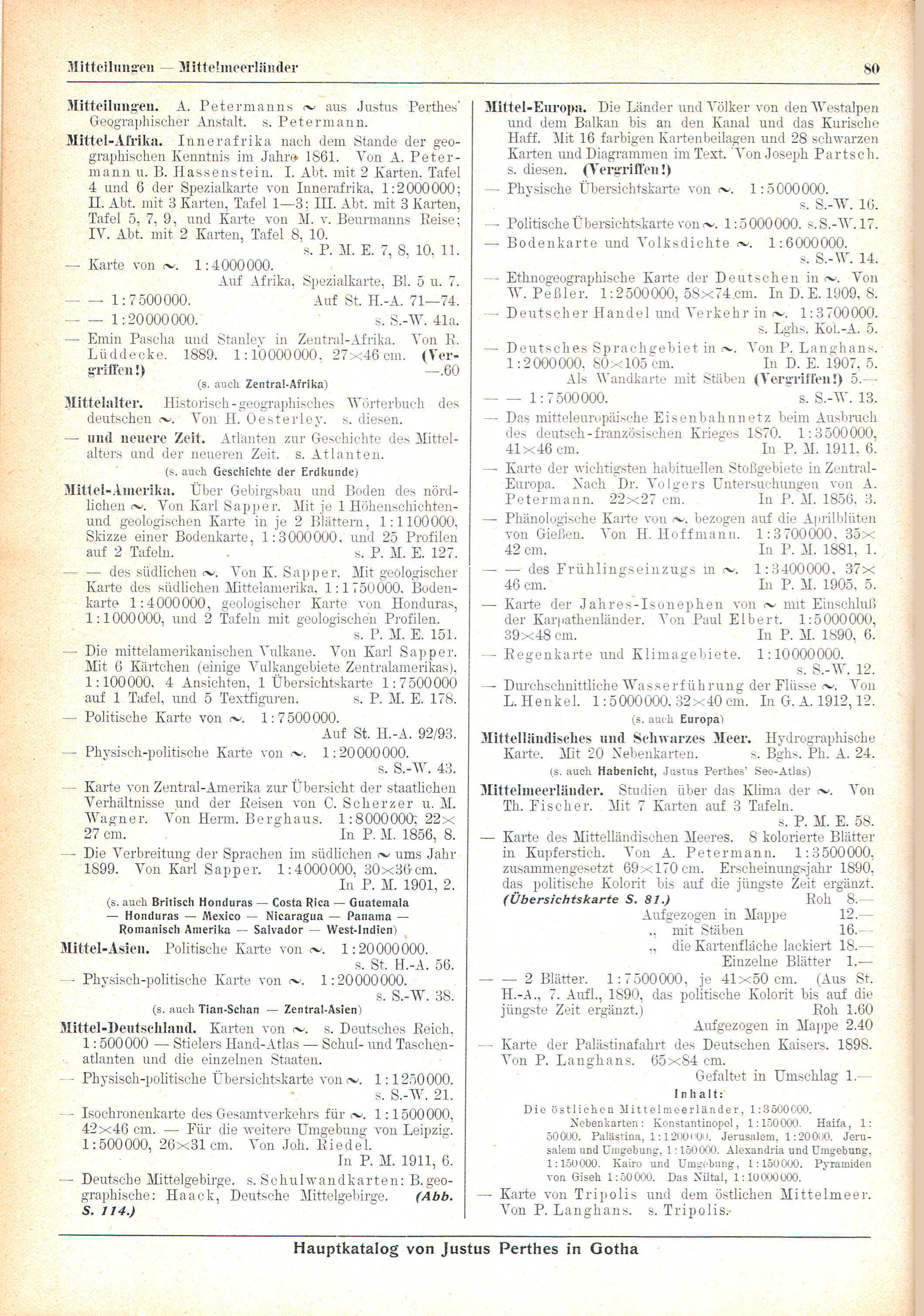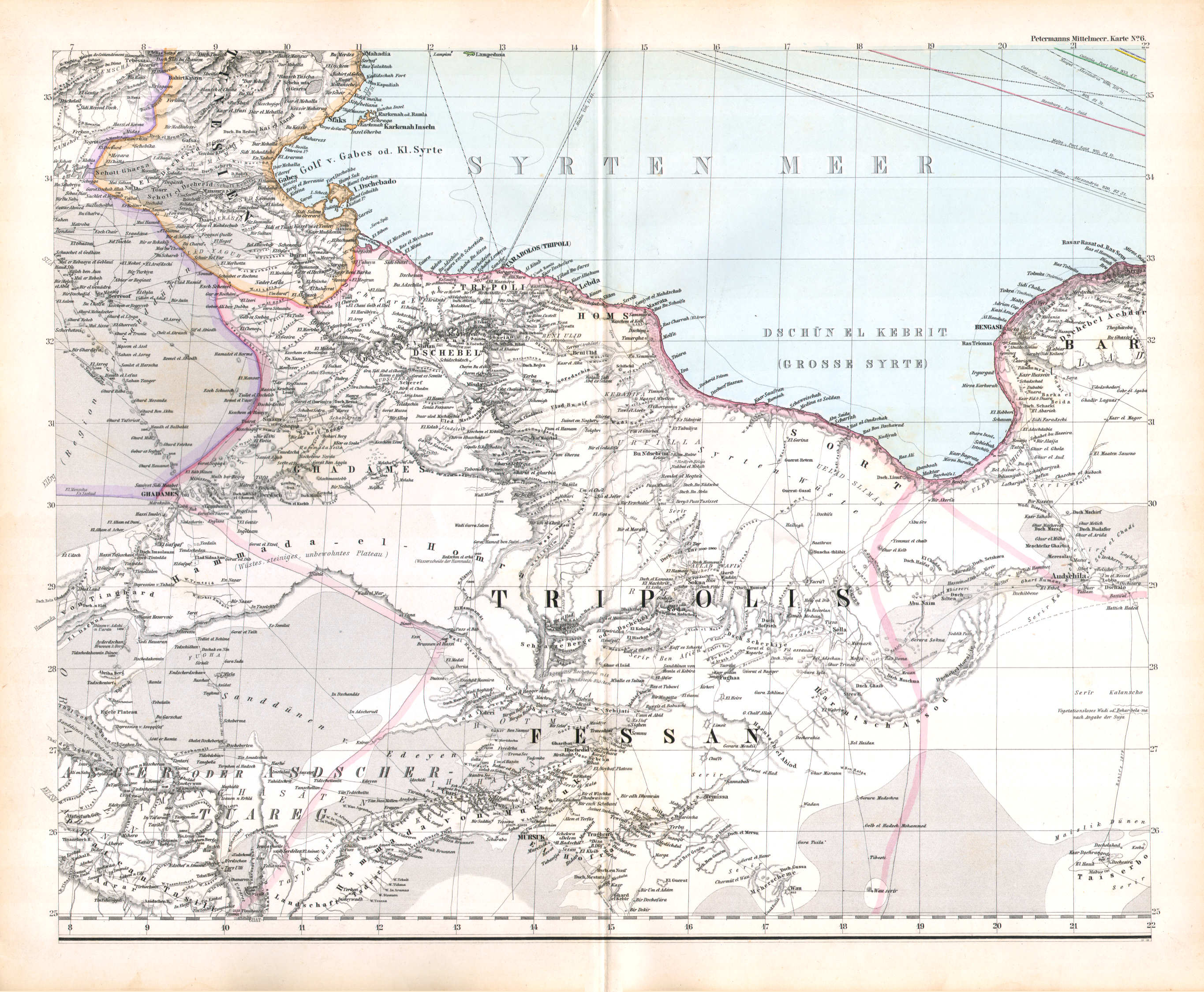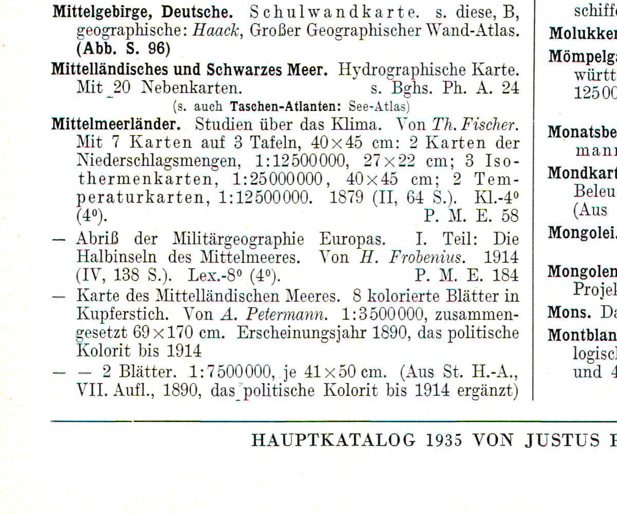 Karte des Mittelländischen Meeres. 8 kolorierte Blätter in Kupferstich. Von A. Petermann. 1:3 500 000, zusammengesetzt 69 × 170 cm. Erscheinungsjahr 1890, das politische Kolorit bis 1914.