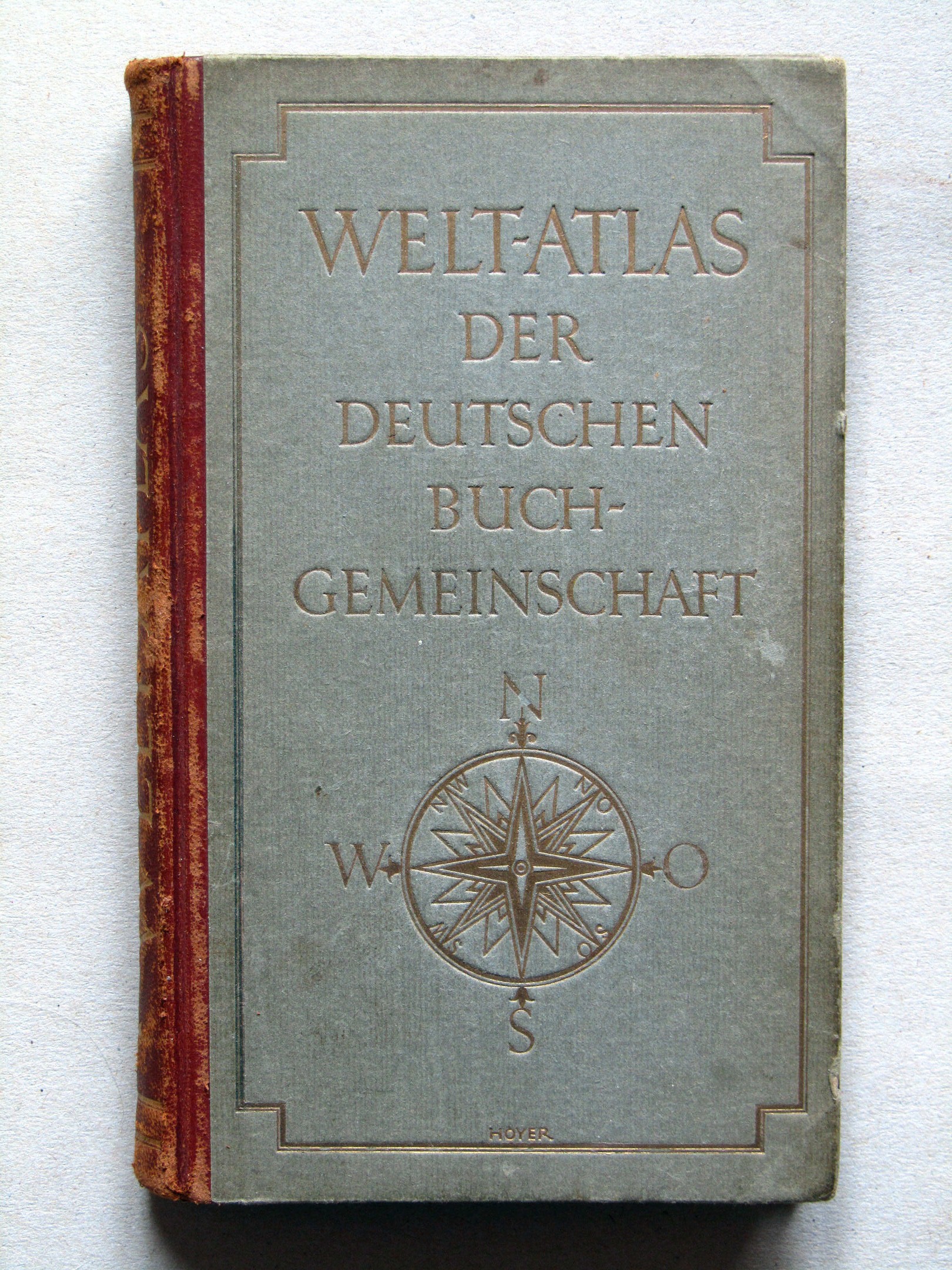 titel boven een kompasroos. Op de rug staat de korte titel "Welt-Atlas". Op het