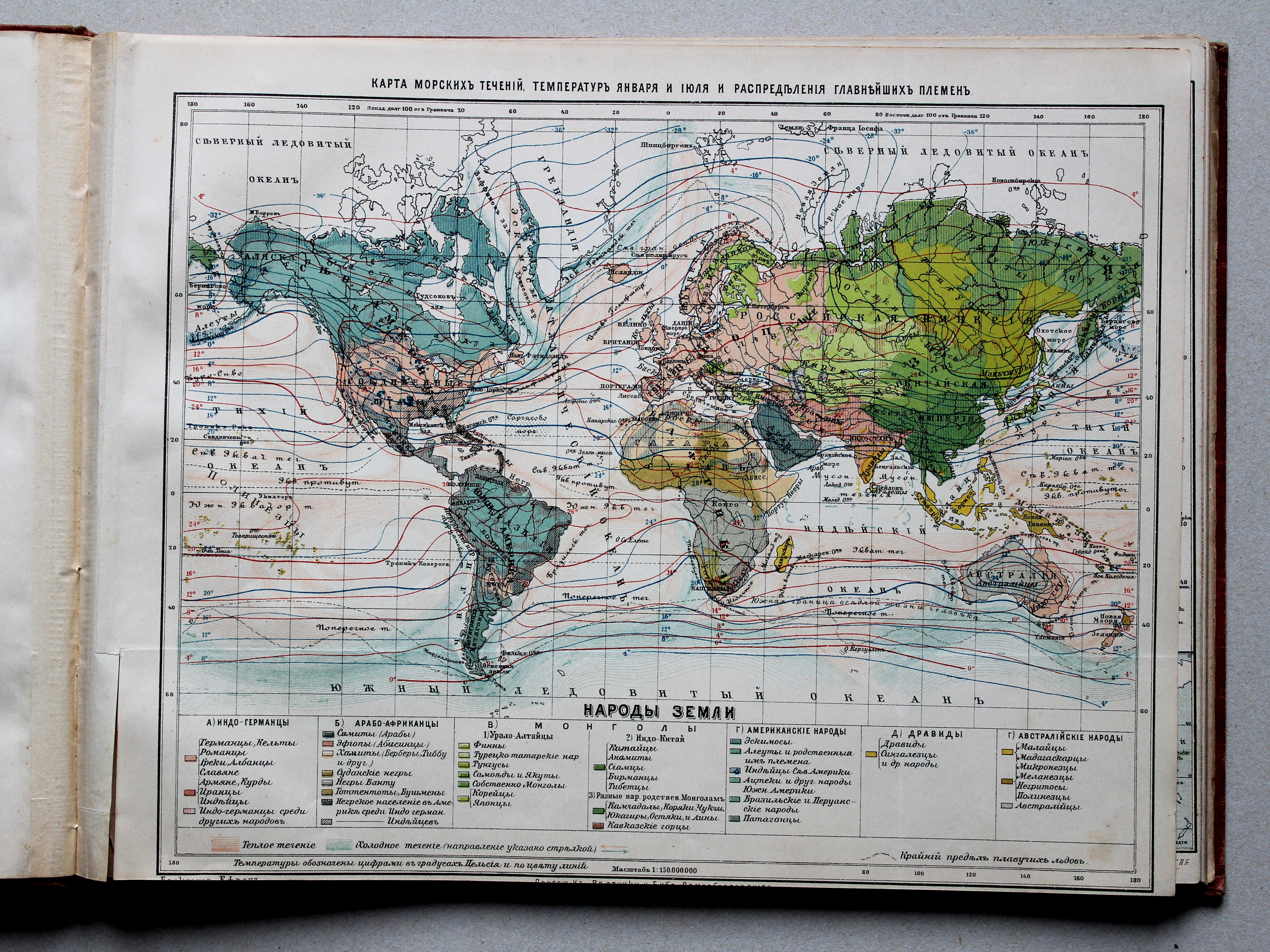 Kaart van de zeestromingen, temperaturen in januari en juli en verdeling van de belangrijkste volkeren /