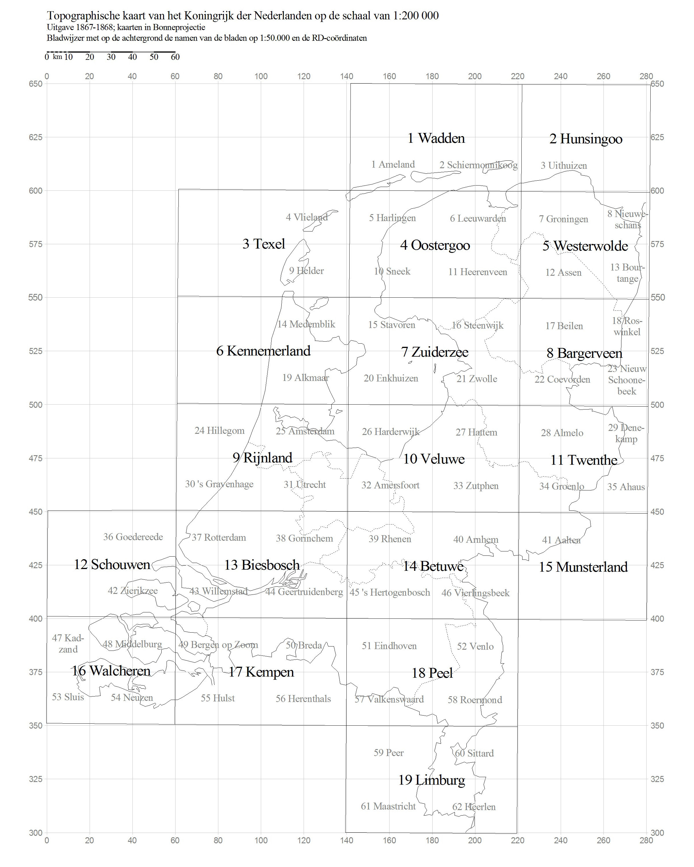 voor een gebied van 50 × 60 km. Elk kaartblad beeldt